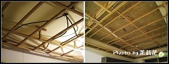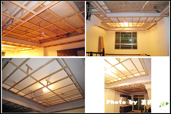 ▼客廳及廚房的天花板角材也都釘上了。