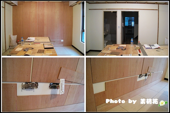 ▼主臥牆面木板也釘上了,原先建商留的插座需要移到兩側,因為中間要放床啦~工作台上還有我們要挑選的木皮。