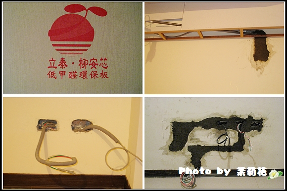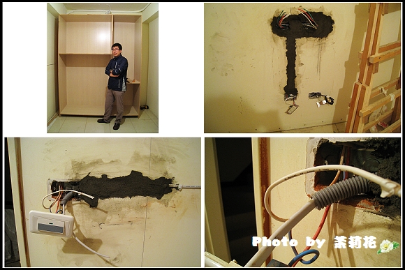 D6:▼今天晚上來拍照時,發現更衣室其中一個衣櫃主體已做出來,Size還真不小;今天水電也順便做一些插座移位的工程,及重拉部份電線;這時我們才知原先建商用的電線真是很細,水電師傅說為了居家安全,還是要用粗一點的電線比較好。
