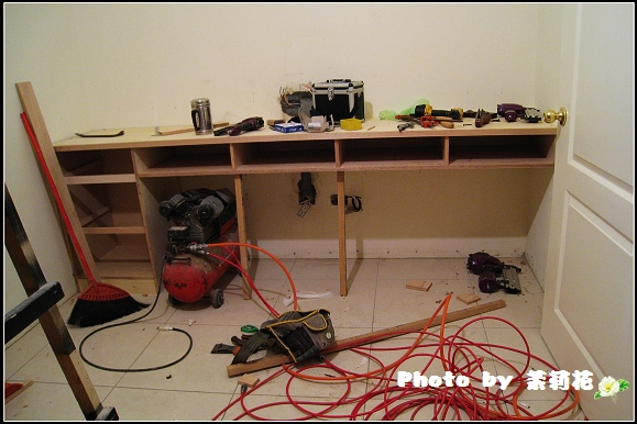 ▼我們要的書桌今天也變出來的,桌上那個黑色盒子是很貴的雷射水平儀,林先生說用雷射一量,就會知道大部份建商蓋的房子都不是很平整。