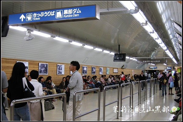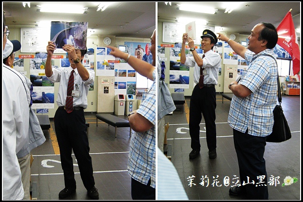 ▼接著在排隊準備進入月台時,有個月台的工作人員開始叫賣這本介紹立山黑部的中文書(¥1,000),領隊姚先生當然要當中文翻譯介紹一下這本書的特色,很妙的是姚先生每說到一個景點,這位先生就會用日本腔跟著複送;姚先生說瀑布,他就跟著唸"布布",剛開始還不知他在講什麼,後來了解他是在講中文後真是笑壞大家,。